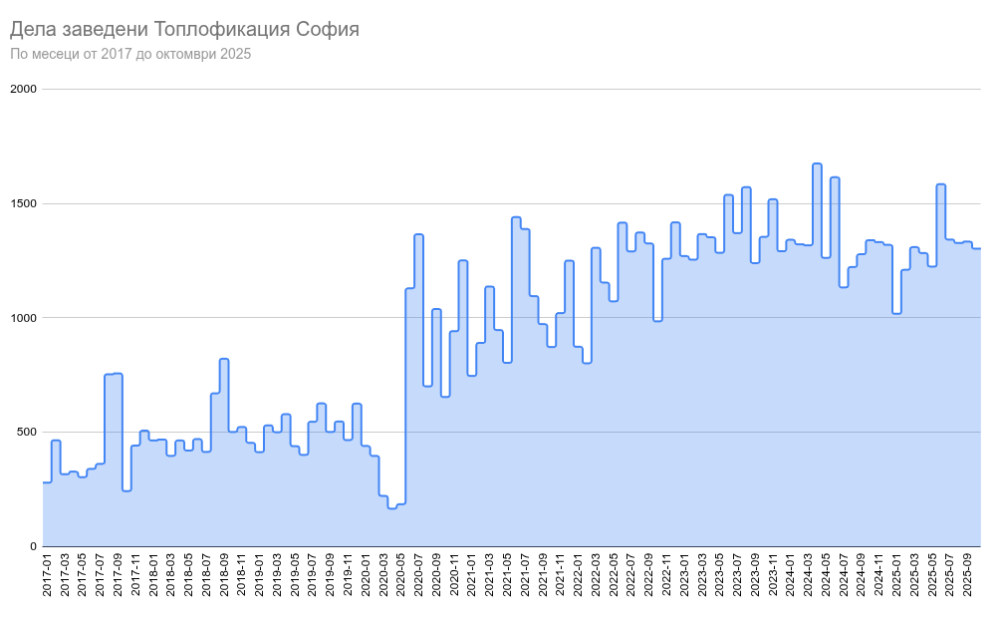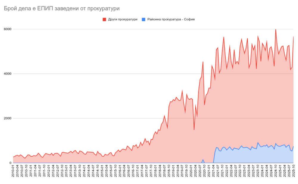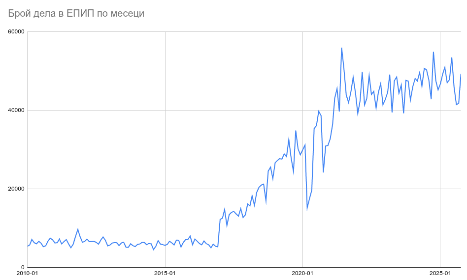 На първата снимка виждате делата по месеци от последните 15 години. Вижда се рязко увеличение между 2016-та до 2021-ва, което може да се обясни по-скоро с качването на данни в системата и липсата на повечето дела преди 2016-та, отколкото друго.