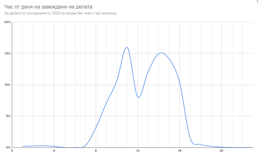 Втората графика показва часът, в който са заведени делата в последните пет години, когато този час е упоменат. Известен е часът за 58% от делата. Вероятно конкретни съдилища не публикуват тази информация, а само дата. Сред останалите се забелязва обедната почивка и края на работния ден. Вижда се обаче интересен феномен за завеждане да 1% от делата с известен част между 1 и 4 часа след полунощ.