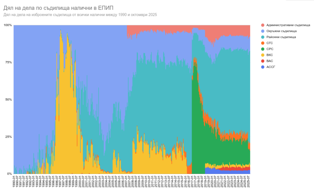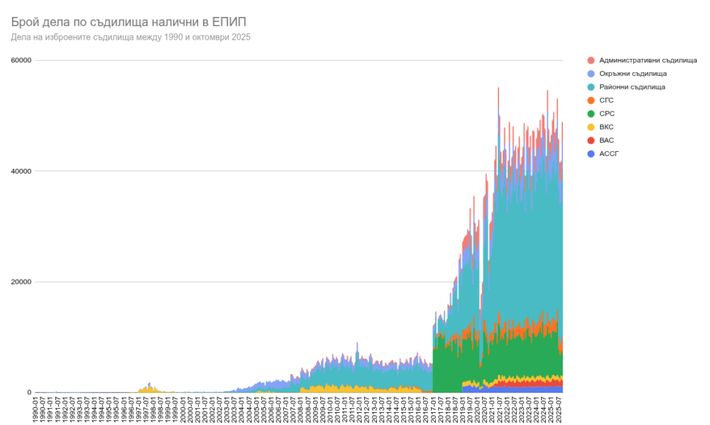 На горната графика съм представил статистика на наличните дела в портала по съдилища. Може би това ще ни даде представа кои не са въвели стара информация или е изгубена в предшестващите им структури Вижда се ясно, че Административен съд – София-град не е представил никакви дела преди 2019-та, а е основан 2007-ма. Висшия административен съд има дела едва след 2021-ва. Висшия касационен съд са публикували за по-дълъг период, но имат дупка между 2017 и 2019-та, както и доста данни преди 2008-ма. Софийски районен съд и СГС не са публикували дела преди 2017-та, както и голяма част от данните на районни, окръжни и административни съдилища извън София. Последните обаче се вижда, че не са публикували и доста дела преди 2021-ва.